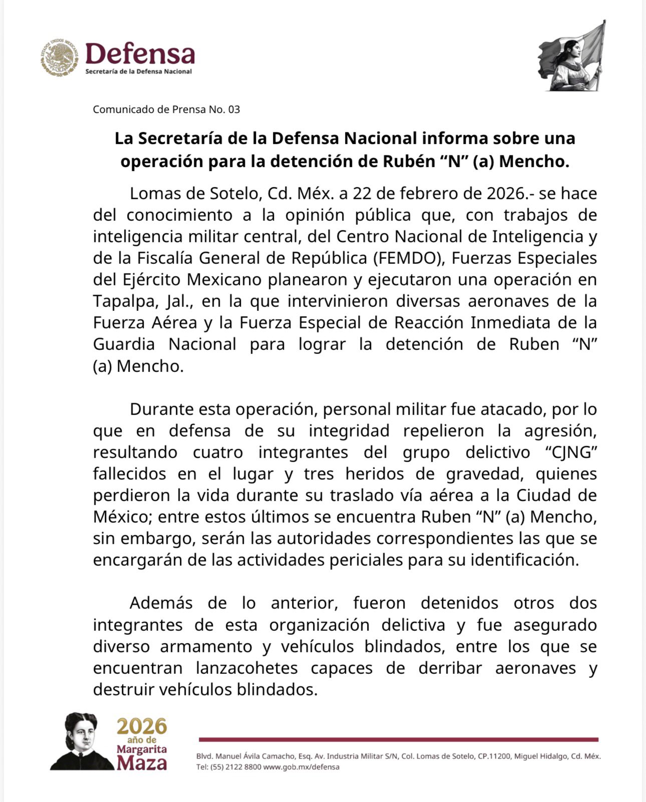 La Secretaría de la Defensa Nacional confirmó la muerte de Rubén “N” (alias “El Mencho”), líder del Cártel Jalisco Nueva Generación (CJNG), tras un operativo militar en Tapalpa, Jalisco.